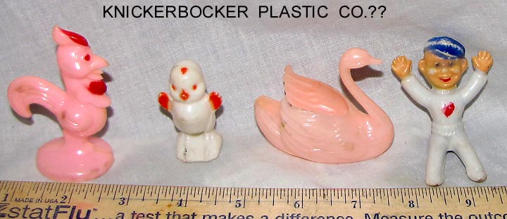 The small standing chick is marked Knickerbocker Plastic Co. Other are unmarked. They all came together but may be by Thomas Toys or Empire Plastic. Most likely used as Easter basket toys.