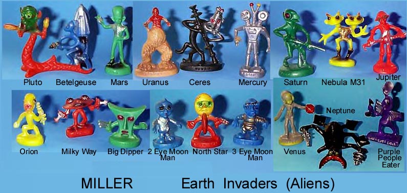 Miller made these; blow molded, waxy, very fragile aliens (Earth Invaders) in the 1950s. I remember have some including the purple people eater lower right (made after a popular humorous song came out with the same title). Can't remember who sent these photos.