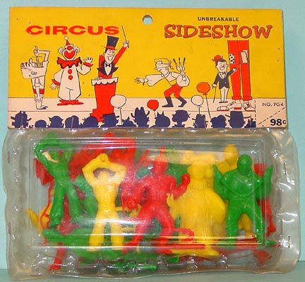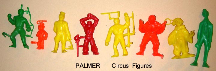 Picture courtesy David Schafer. The owner of Palmer died in 1972 and the company was sold to Winneco Industries we we think also took over Payton also located in Brooklyn. This jobber bag of circus figures was probably produced in this time period. By the late 1970s Palmer and Payton were bought by HG Toys. The Palmer circus (Sideshow) figures seem to be about 60-70mm in scale. Six of the eight figures originally came with separate accessories. These small pieces have had a way of disappearing over time.