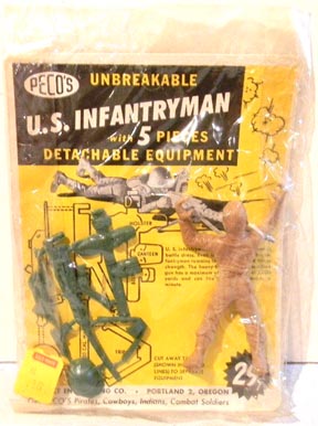 O'Brians COLLECTING TOY SOLDIERS #3 has these shown as; "Kilty Soldiers made by Bonnie Bilt" of New York. These GI flats come in two sizes. With the exception of the mounted pose which we have seen only in the small size all poses are found in both sizes. Both sizes can be found in both hard plastic and soft plastic. The hard plastic figures are shades of green while the soft plastic figures are silver. PAL sold hard plastic versions in header card bags as seen above. REMCO included them with some versions of their Bulldog tank. The open window boxed set pictured above contains soft plastic figures but has no manufacturers markings. We believe multiple companies were involved in either the manufacturing or sale of these figures. As Bonnie Bilt was the first to make them individual figures will be listed at the Bonnie Bilt page (All other A-O makers).