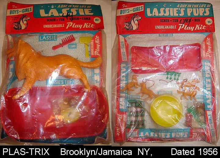 Plas-Trix was located in Brooklyn and nearby Jamaica in the greater New York City area. They are best known for their small plastic sliding puzzles. They started up in the late 1940s but we do not know what happened to them. Lassie sets picture courtesy of Atomic Candy.