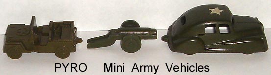 Jeep (1 1/2 inches long) is marked with Pyro pennant logo, Cannon has tiny unmarked pennant and sedans are unmarked (License Plate #DP7189), but they were all found at one time so unless other information is forthcoming we will assume that all three pieces are PYRO. Lido's mini jeep seems to be a close copy of the PYRO example. Made of hard Plastic.