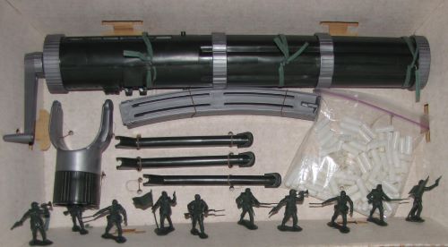 Rocket Launcher. Has original box that is in poor shape. Spring shooting rocket works + 2 copies of LIDO GIs. 1950s era.