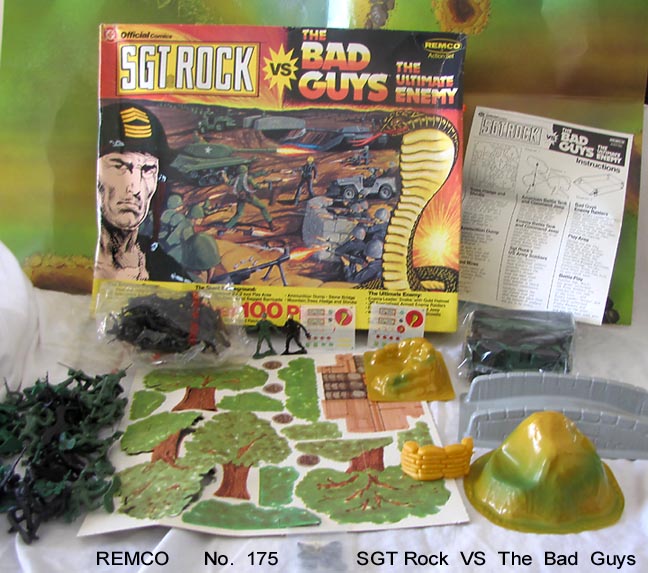 No. 175 SGT Rock vs The Bad Guys The Ultimate Enemy, dated 1982.Contents; large playmat, 2 tanks, 2 jeeps, 37 good guys (SGT Rock's face painted), 37 bad guys in black with their leader "Snake's" helmet painted gold (all figures knockoffs of Processed Plastic/Tim-Mee Vietnam GIs), vacuform; bridge, rock formation and sandbag emplacement. Blow molded sand bags. Small bag of shovels and walkie talkies. Cardboard punchout; scenery, oil drums & mines. Two small sheets of decals + instructions. Official DC comics licensed product.