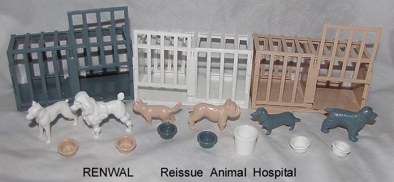 Reissue Animal Hospital animals, cages and accessories. Each set has; 3 double room cages, 6 animals, 6 food bowls and one waste basket. Colors will vary.