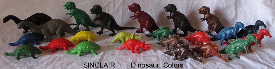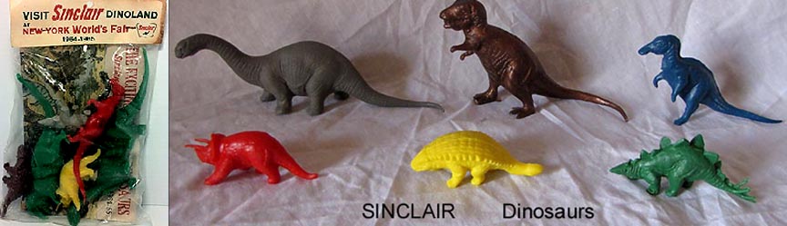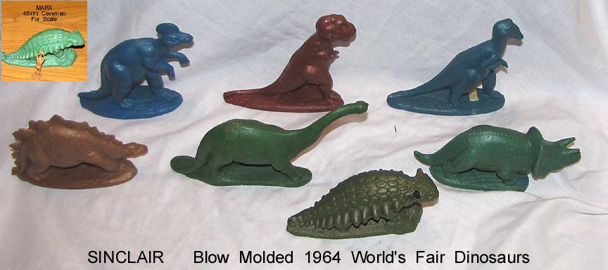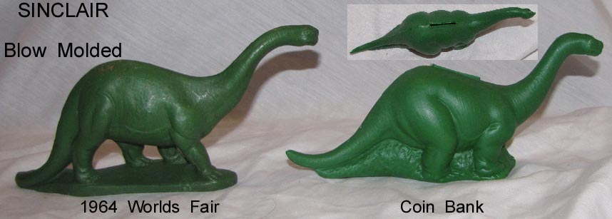later Sinclair made a new blow molded Brontosaurus with a slot on the top to be used as a coin bank. Note the World's Fair example has gut aways around the legs where as the bank is solid.