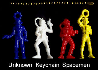 This set was sold on a blister card. The one example we have seen had the pieces split into 3 different colors with pieces still attached to the sprue tree runners. The set consists of a four piece space capsule (3 pieces in one color 4th piece (door) sometimes in another color) and 9 figures in 7 poses. There were three of the astronaut walking (in different colors in the one set we have seen) + one each of the space chimp and other five human poses. Made in soft plastic, the set was run in blue, green, red, yellow, white and tan colors. The space capsule does not have a bottom and we think that perhaps the original plan was for it to be similar to the Marx capsule with a place to seat the sitting astronaut (who now has no where to sit in this set).