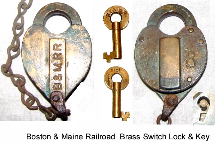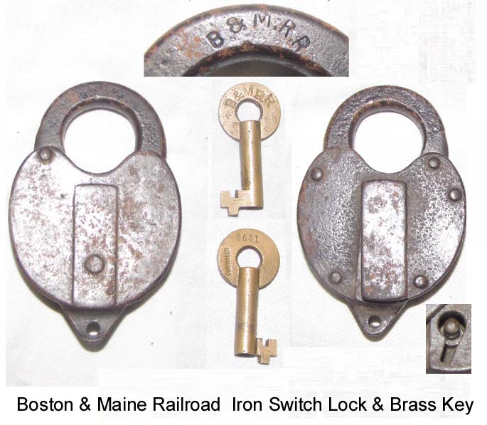 - B&M; RR (Boston & Maine Railroad) incised on rear of shackle, BOHANNAN (worn mostly off) incised shackle front, no chain. Iron switch lock. Key marked B&M; RR, SLAYMAKER, 8681.