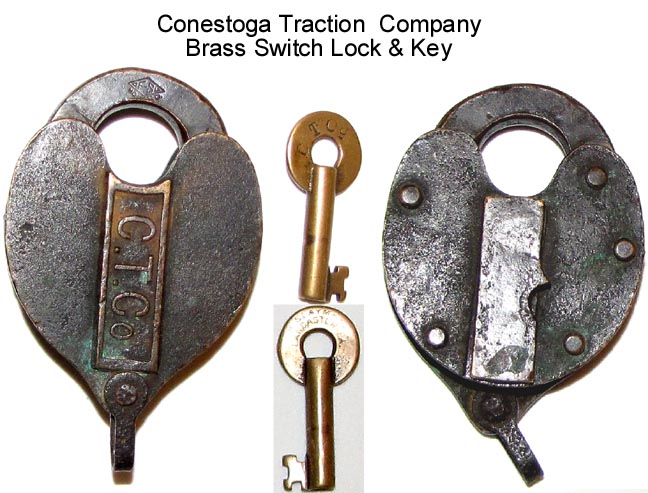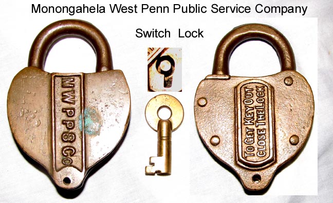 - MWPPSCO (Monongahela West Penn Public Service Co (cast back panel) , TO GET KEY OUT CLOSE THE LOCK (cast dust cover), brass heart shaped lock, no chain, has unmarked key that opens the lock with a bit of help(pull outward as you turn the key and the lock pops open nicely). Ohio and West Virginian traction line.