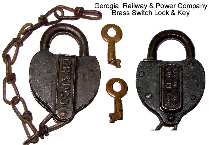 - GR&PCO; cast on back PANEL, TO GET KEY OUT CLOSE THE LOCK cast on dust cover, Georgia Railway & Power Co's Atlanta trolley system brass heart shaped switch lock, NO chain, unmarked key that works with help.