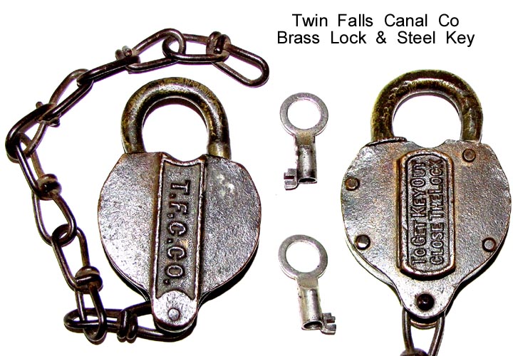 - T.F.C.CO. (Twin Falls Canal Company), cast on back panel of lock, TO GET KEY OUT CLOSE THE LOCK cast on dust cover, brass lock. Has chain and unmarked steel key.