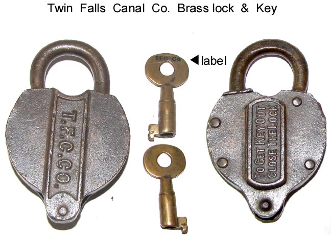 - T.F.C.CO. (Twin Falls Canal Company), cast on back panel of lock, TO GET KEY OUT CLOSE THE LOCK cast on dust cover, brass lock. No chain but has old perhaps original unmarked key (label on key).