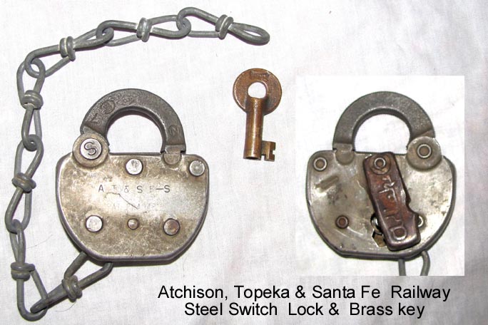 AT&SF; -S, incised back, S on rivet, ADLAKE embossed on dust cover, steel lock with chain. Has brass key marked FRAIM (banner). Atchison, Topeka & Santa Fe railway