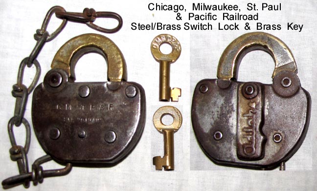 - CM&STPRR; (Chicago, Milwaukee & St.Paul Railroad) cast back panel, no makers mark. No chain. Has later key marked CM&STP;&P;. Nice working brass heart shaped switch lock. Some times you need to turn the key 2 or 3 times but then the lock pops open.