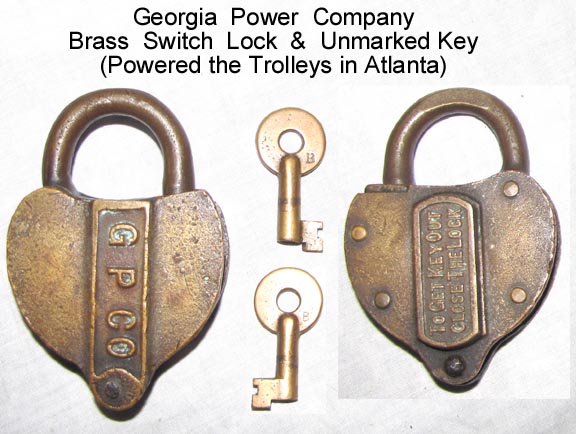 - GPCO cast on back PANEL, TO GET KEY OUT CLOSE THE LOCK cast on dust cover, name changed in 1926 to Georgia Power Co's Atlanta trolley system brass heart shaped switch lock, NO chain, unmarked key opens lock easily (deduct $10 from the price if the key is unwanted).