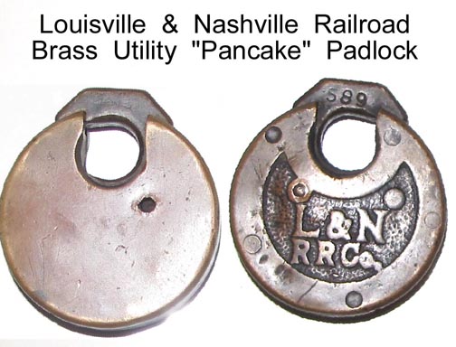 - L&NRR; (Louisville & Nashville Railroad) cast on side, small brass utility "pancake" lock. No push key. One rivet missing, shackle has good play and lock should work.
