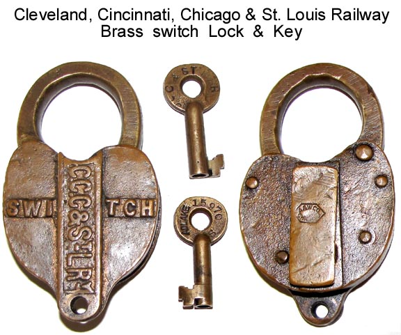 - CCC&STLRR; (Cleveland, Cincinnati, Chicago & St.Louis Railroad cast on back panel, A&W;(hex) incised on drop, main line brass heart shaped lock, no chain, has key CCC&STLRR;, ADLAKE(curved), S, 15970.
