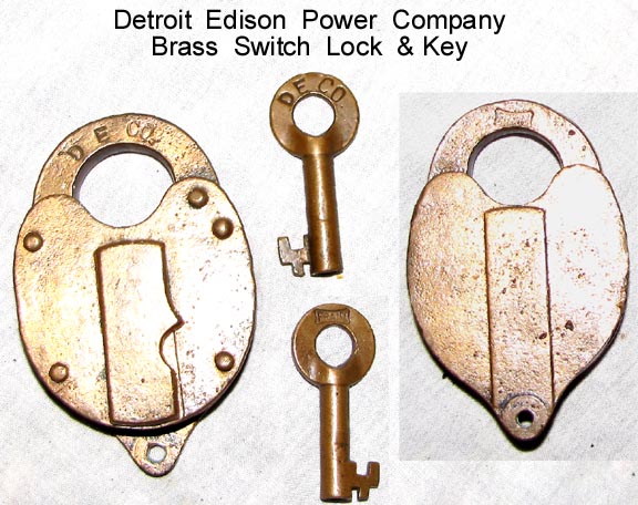 - DECO (Detroit Edison Company incised shackle front, FRAIM (Banner Logo) incised on shackle rear, brass heart shaped lock, no chain. Has working key DECO FRAIM (banner logo).