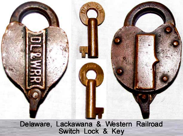 - DL&WRR; (Delaware, Lackawanna & Western Railroad cast on back panel, FRAIM incised on shackle rear, DL&W; incised on shackle front, main line brass heart shaped lock, no chain. Has key marked DL&W; RR, SLAYMAKER, 3388.