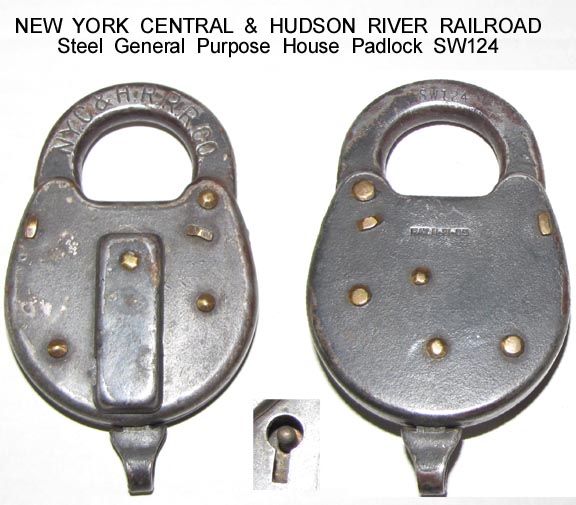 NYC&HRRR;, incised shackle front,SW124 incised shackle back, PAT 11-21-85 incised back. Has chain but no key. Steel general purpose lock. Takes a small hollow barrel key like this one