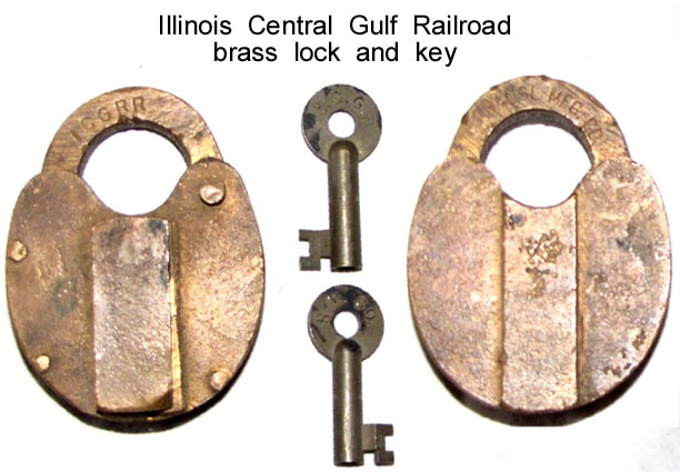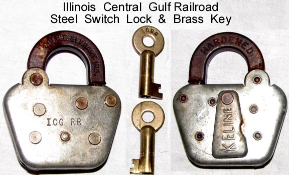 ICGRR, incised back, Keline embossed on dust cover, steel lock with chain. Has brass key marked ICRR (Keyline key). Illinois Central Gulf railroad