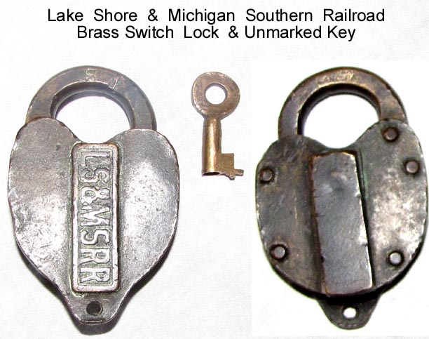 - LS&MSRR; cast on back panel, SLAYMAKER incised on shackle front, S incised on shackle rear, main line brass heart shaped lock,no chain, unmarked key opens lock easily (deduct $10 from the price if the key is unwanted).