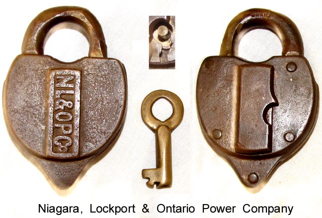 - NL&OPCo; (Niagara, Lockport & Ontario Power Company), cast on back panel of lock, FRAIM incised shackle front, brass lock, NO chain, has key NL&OPCo;, FRAIM (Banner).