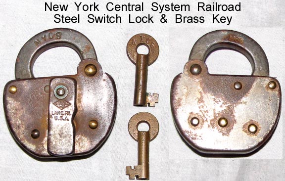 NYCS, incised lock back, ADLAKE embossed on dust cover, steel lock with chain. Has brass key marked NYCS, ADLAKE. New York Central System railroad