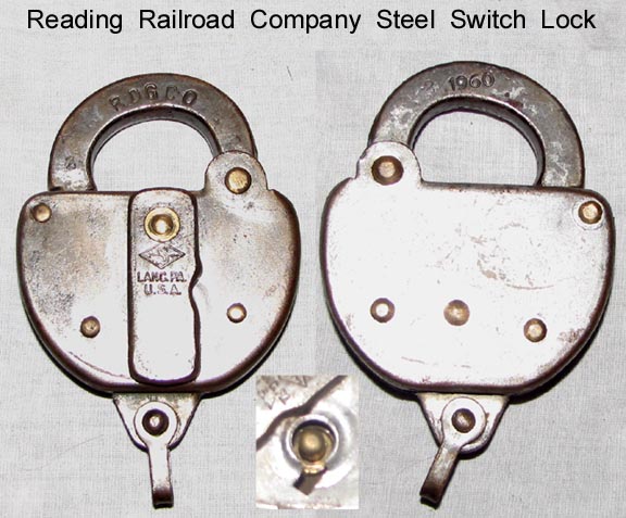RDGCO, incised shackle front, 1960 incised shackle back, Slaymaker logo incised dust cover, steel lock with brass rivets, no chain. No key. Reading Railroad Company. Keying is the reverse of the main line switch locks so probable repair track usage.