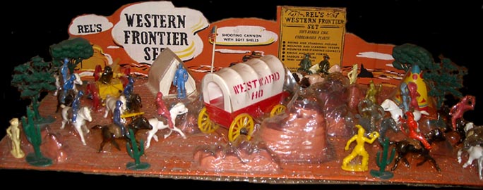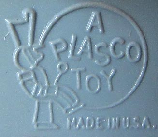 REL PLASTICS was a mold making company that started up in 1948. They made molds for the home, auto and toy industries. To sell the toys from their molds a subsidiary was created, the PLAStic Art Corporation. They compressed the name to PLASCO to use as a marketing slogan. They made and sold tea sets and doll house furniture for girls and western themed figures and playsets for boys. They originally used styrene hard plastic but an ad from a 1957 Dearth's Hobby & Toy center has a western playset touted as being "made of soft, rubber like unbreakable plastic". Other toy companies like Lido Toys and Archer also switched from hard to soft plastic in the mid 1950s as it was safer for children to play with. About 1963 REL stopped making toys to concentrate upon the auto industry. They went out of business in the early 1980s.