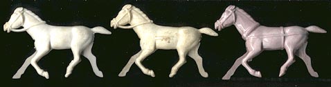 Rel made two horses, one for mounted figures and one for the wagons and caissons with harness straps. The pose is the same. There are two slight versions of the horse used for mounted figures. The middle horse in the picture has a slight protrusion after the front leg. Many fanciful swirl plastic colors can be found.