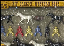 Early 1950s figures may come with swirled plastic and factory paint. Some figures may have yellow paint applied at factory as flesh! Earlier figures (1951-56) are hard plastic while later ones (1957-63?) were made in soft plastic. The stagecoaches, wagons, caissons and cannons were made of hard plastic and can suffer from heat warping after years of storage in attics. We have found the caissons and cannons in soft plastic but are unsure if the wagons were ever made in soft plastic. Plastic Art had a nice line of plastic tea sets and doll house furniture, but the western themed sets seem to have become the companies most popular sellers (at least for boys). The western figures were sold in header bags, small and large boxed sets.