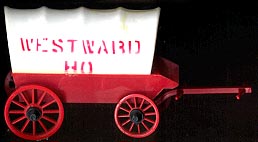 Like the nice Rel stagecoach the wagons front two wheels are attached to the separate wagon tongue. Wagon tongues exist for teams of two or four horses. Wheels were originally held on by "hub caps". This was eventually changed to a wheel with hub extension molded as one piece. Some wagons have words on the covered top (as seen above). The wagons have not fared well over the years as heat tends too warp them. The mold still exists and recasts/reissues have been made since about 1995.