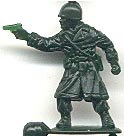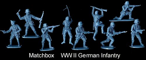 Matchbox German InfantryThis 9 pose set usually has one each of the officer, flamethrower and with schmisser x waist and two each of the other six poses. Original figures were in bluegray ("P" series box) later issue (40000 series box) were in waxy light gray. Later reissued by The Toy Soldier Co. in a variety of colors.