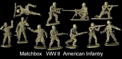 Matchbox American InfantryThis 11 pose set usually has two each of the standing shooting rifle, kneeling shooting rifle, crawling with rifle and charging with rifle and one each of the other 7 poses. Original ("P" box) figures were in pale green while later (40000 series box) figures were in dark waxy green.