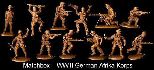 Matchbox Afrika Korps FiguresThis 12 pose set usually came with two each of the standing shooting rifle, kneeling shooting rifle and crawling with rifle and one each of the other 9 poses. Original ("P" box) figures were in dark tan while later (40000 series box) figures were in light tan. A few original sets were also made in pale green.