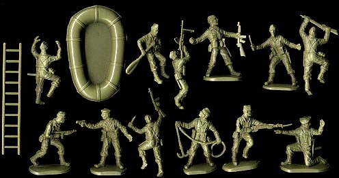British CommandosThis set has 15 pieces like the others but only 13 figures in 12 poses (duplicate of crawling pose). The other two pieces are a ladder and small raft. Original figures ("P" box) are pale green while later (40000 series box) are light tan.