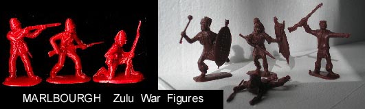 Marlbourgh made lead figures. Using their lead figure molds in the 1980s they made a short run of the above seven Zulu War poses. Made in a stiff plastic they are now quite hard to find. Picture of Zulus courtesy Fritz Juengling.
