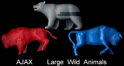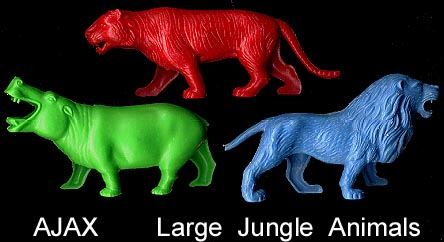 These were made by Ajax and then RECAST in the 1970s & 1980s by Joy Toy (as seen in the Joy Toy catalog pictures shown above generously given to us by Seymour Arenstein's daughter Joy A.Glucksman), and some in the 1990s by Tootsietoy. We do not know how to tell the difference between the Ajax, Joy Toy & Tootsietoy pieces. Most of the loose pieces probably date to the later Joy Toy or Tootsietoy production. Animals seem to have been made in sets of six but we are not certain if that was always true.