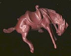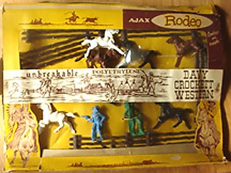 Ajax either made copies of many of the Bergen figures or had Bergen wholesale them figures, or got access to the molds after Bergen's demise in 1958. If a "Bergen" figure does not have a logo then we assume it was sold by Ajax. You can see examples of Bergen copies in the above Ajax rodeo playset. As the rodeo set has had a Davy Crockett banner added it is likely that it was sold in 1954 or 55 during the Davy Crockett mania brought on by the Disney episodes starring Fess Parker and Buddy Ebson. Ajax did not even bother to try and include a pioneer type figure. All of the figures and horses in this set are copies of Bergen figures. Although Ajax did mark some of their horses with AJAX, the above examples are marked MADE IN USA which is the more commonly seen Ajax horse.