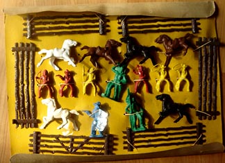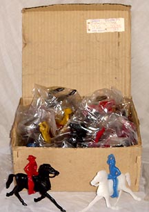 Above are some of the Ajax 5 inch cowboys & Indians. Sealed bag in picture below also has a cowboy shooting a rifle. Perhaps six different cowboys and six different Indians were made but we are not sure. Picture of yellow cowboy top right courtesy of Eric Johns.