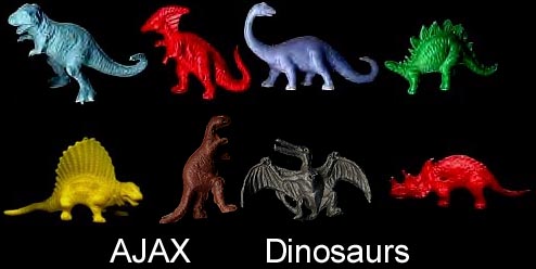 AJAX DINOS Mostly polyethylene but Some were made in a rubbery plastic.