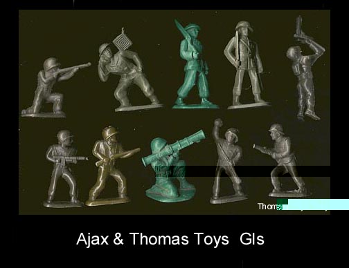 These Barclay copies? date to the 1950s. First made of hard plastic with a bit of paint, then hard plastic no paint and finally a dense soft plastic. There were two different shades of green in the soft plastic versions. HP figures do not have paint unless noted. The soldier with flamethrower can be seen in Thomas Toys Catalogs. Thomas Toys had no connection to Ajax but perhaps William Shaland(father in Law to Ajax's owner) a toy wholesaler had control of the mold(s) and supplied both Ajax and Thomas Toys. We think the mold may have contained 12 cavities with three soldiers with rifle at waist, two with tommygun at waist and one each of the other seven poses. This is based upon what we have seen over the years and can not be confirmed.