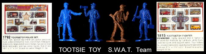 Seen in the 1979 Tootsietoy catalog as parts of an otherwise die cast Police set in blue and a Fighter Command military set in brown. Figures are about 50mm in size.