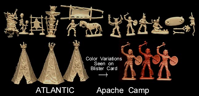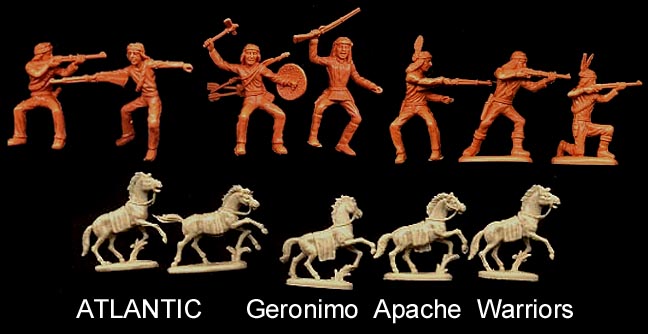 An 11 piece set with 3 foot and four mounted figures + 4 ponies. This set often has "Sitting Bull" in the title which is incorrect as he was a holy man not a warrior. This is a very difficult set to find in 1/32, and even Atlantic did not help by putting Apache Warriors in the last run of Siuox Warriors boxes.