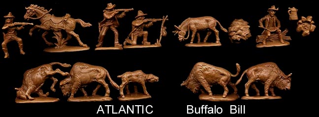 A nice 14 piece set. There are four different hunters including Buffalo Bill possibly trick shooting while riding a horse. Also included are campfire with coffepot, a donkey with separate fur load and five different Bison (American Buffalo). We have seen this set in a variety of tans and browns. It came in both boxed (1202) and blister card (#19) sets.