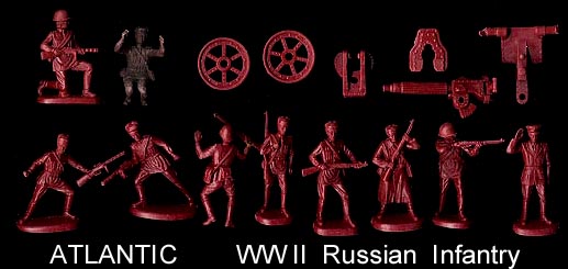 The WWII Russian set has 10 different 54mm figures + a 7 pc heavy MG. One of the kneeling figures is designed to be the MG operator. This set has been made in red, redbrown and brown colors.