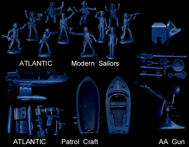 This set has 11 different 60mm figures. Three are seated and are used with the coastal patrol boat and AA gun also made by Atlantic. We have only seen these in shades of blue.