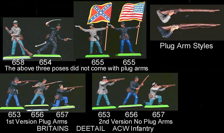 Three of the original Deetail ACW foot figures had arms that plugged on and were glued in place. These were made from 1972 to 1980 when the mold was remade and all six figures were each made in a solid body with no arms to be glued on (but with shorter rifles). These slightly larger figures were made from 1980 to the end in 1998. We have a hard time telling the earlier nonplug arm figures from the later versions and will not attempt do do so. Slight variations in accessory paint schemes also exist. The early plug arm kneeling firing poses also came with two styles of rifles, one with a strap(Union version above) and one without(Confederate version above)