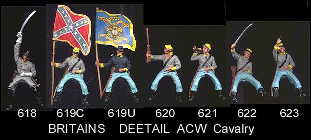 Figures for both sides are identical. The Cavalry flag the Union figure carries is different than the one carried by the Union foot figure. The mounted figures were made from 1971 to the end in 1998. The officer (618) an figures with sword(622) and pistol(623) have plug on arms that allow for some degree of variability. The pistol pose(623) with a different arm was also used as a limber rider.